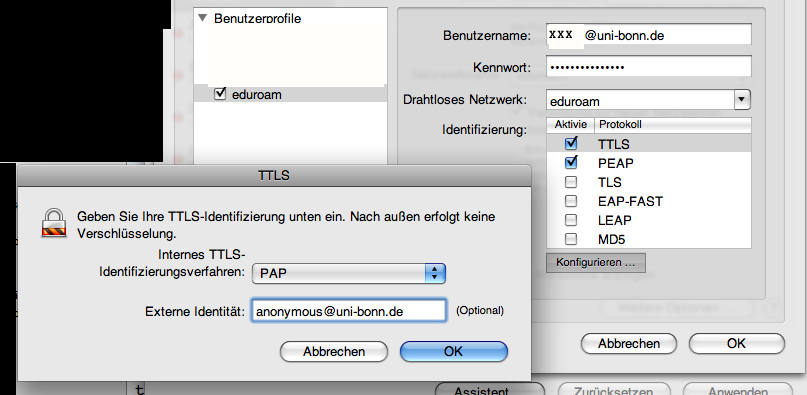 The essential thing was to do a proper configuration of the TTLS protocol. Just log in with your username at uni @ the university’s email suffix. Moreover, keep in mind that there may be an external identity (here: anonymous@…), which is different from your actual identity.