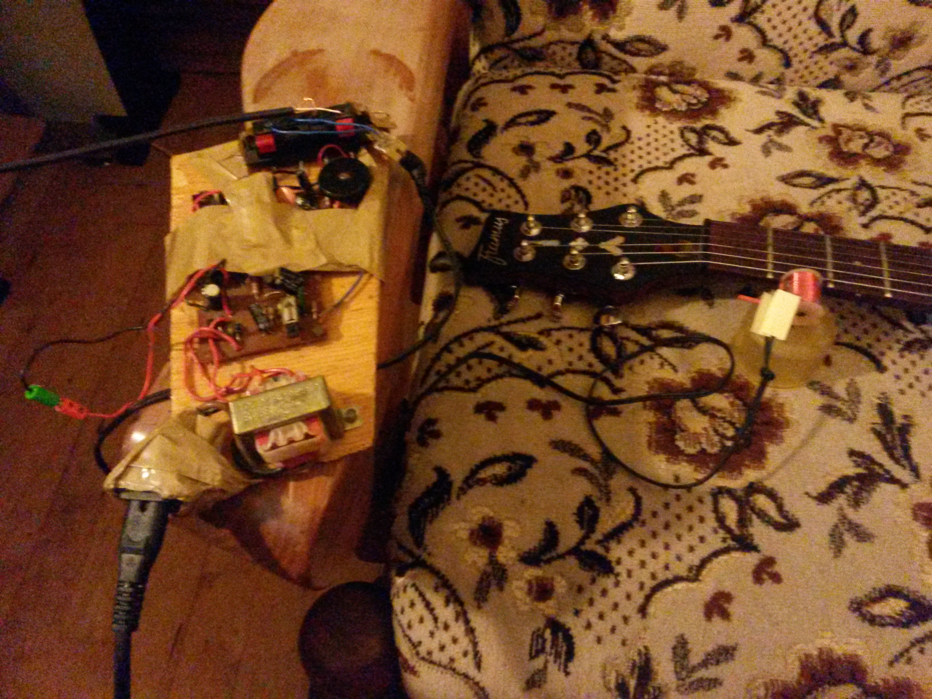I’ve hooked up a more or less random electromagnetic coil to an old cassette player amp. The coil is positioned between the 1st and second fret (got a lot of good sounds there). There’s a lot of recording noise due to low levels (have to find a better amp for the coil)