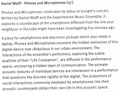 Phones and Microphones is a piece for Phones and Microphones in multichannel Diffusion. It also needs at least 2 laptops with ensemblists to play them.